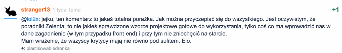 jejku, ten komentarz to jakaś totalna porażka. Jak można przyczepiać się do wszystkiego. Jest oczywistym, że poradniki Zelenta, to nie jakieś sprawdzone wzorce projektowe gotowe do wykorzystania, tylko coś co ma wprowadzić nas w dane zagadnienie (w tym przypadku front-end) i przy tym nie zniechęcić na starcie.