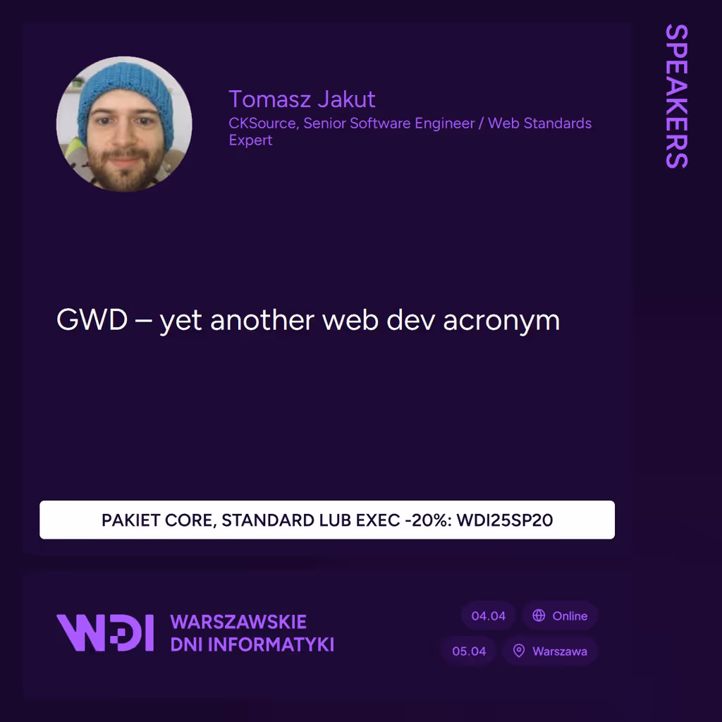 Ja też będę… duchem, niekoniecznie ciałem. W trakcie trwania konferencji będzie można posłuchać mojej prelekcji w sekcji przygotowanych i nagranych wcześniej materiałów (VoD). Tytuł mojego wystąpienia brzmi GWD – yet another web dev acronym i będzie takim szybkim wprowadzeniem do GWD, ale tym razem po angielsku.